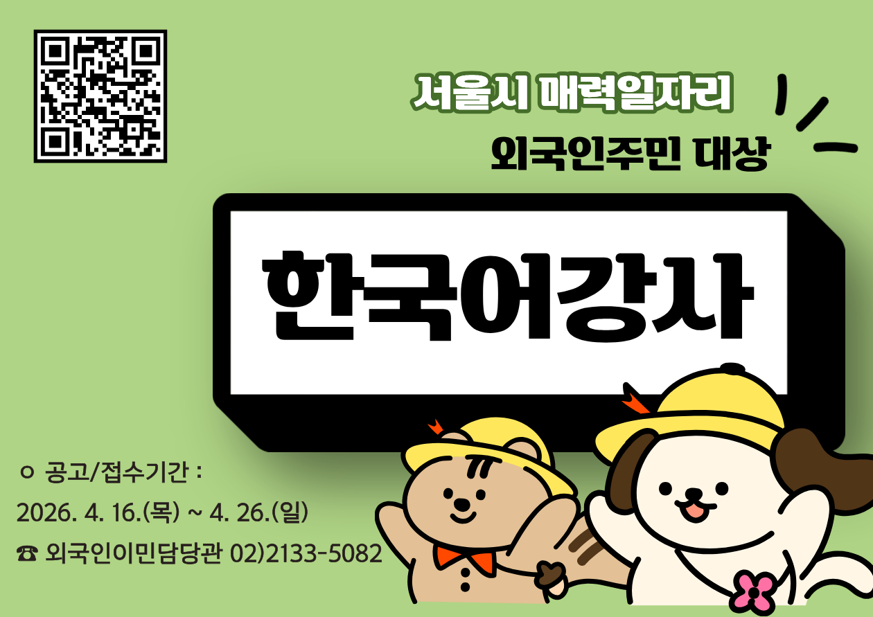 - 자격 : 만 18세 이상 ~ 만 39세 이하, 서울 시민, 한국어 교원 자격 2~3급 소지자