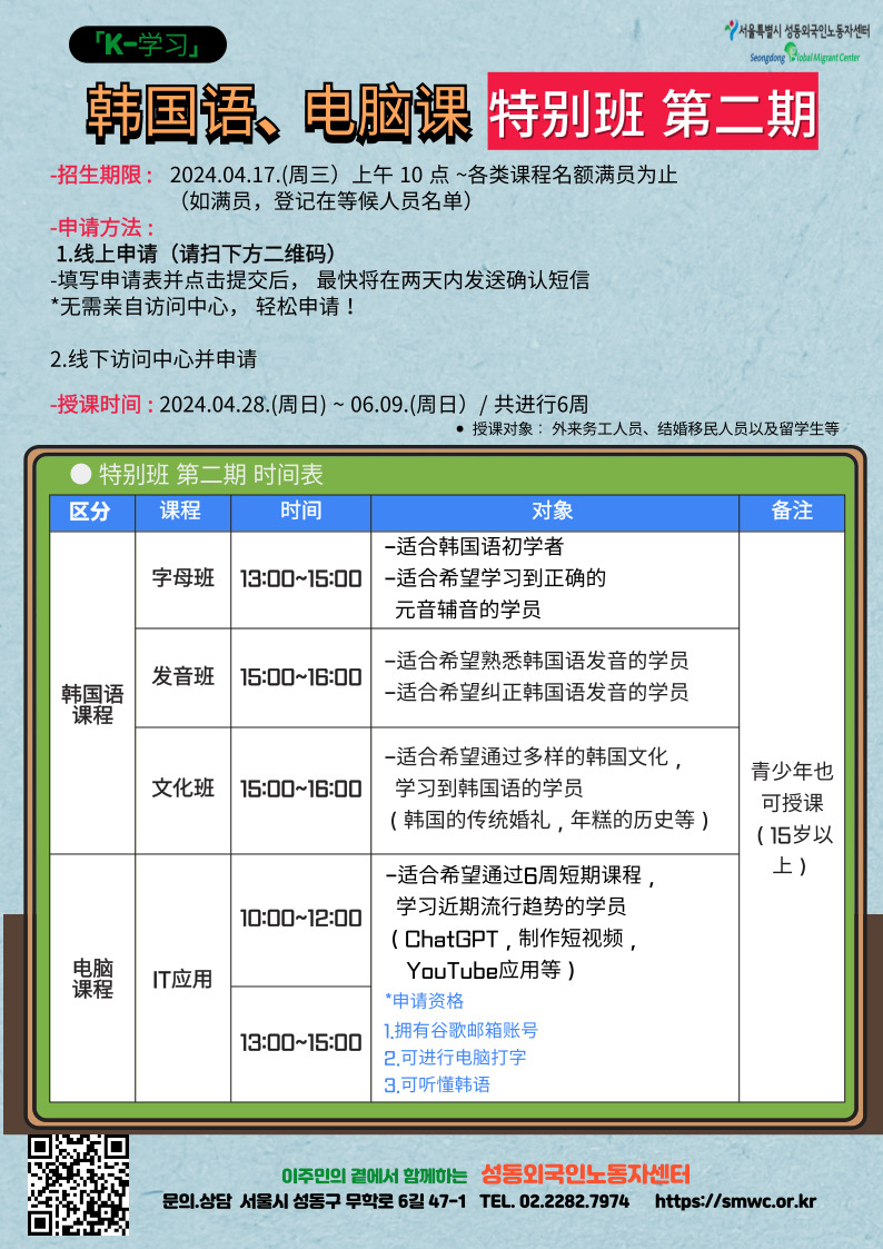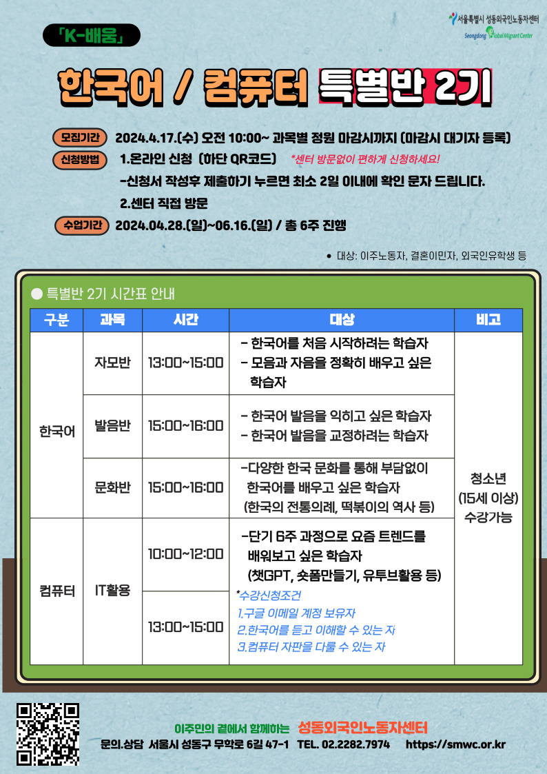 「K-배움」특별반 2기 수강신청 안내문 (자모반, 발음반, 문화반, IT활용반)