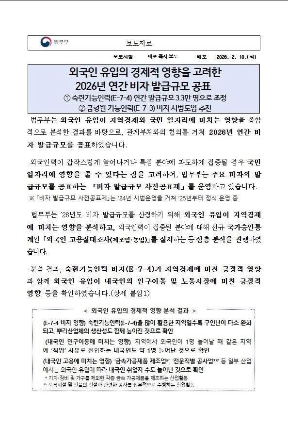 법무부 외국인 유입의 경제적 영향을 고려한 2026년 연간 비자 발급규모 공표